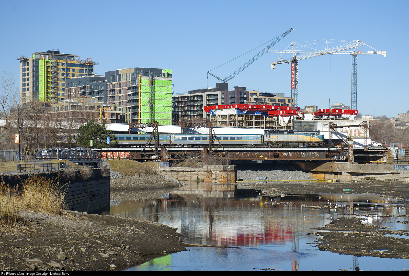 VIA 6412 leads VIA 33 past an ever expanding wall of condos as it passes the out of use Wellington Tower.