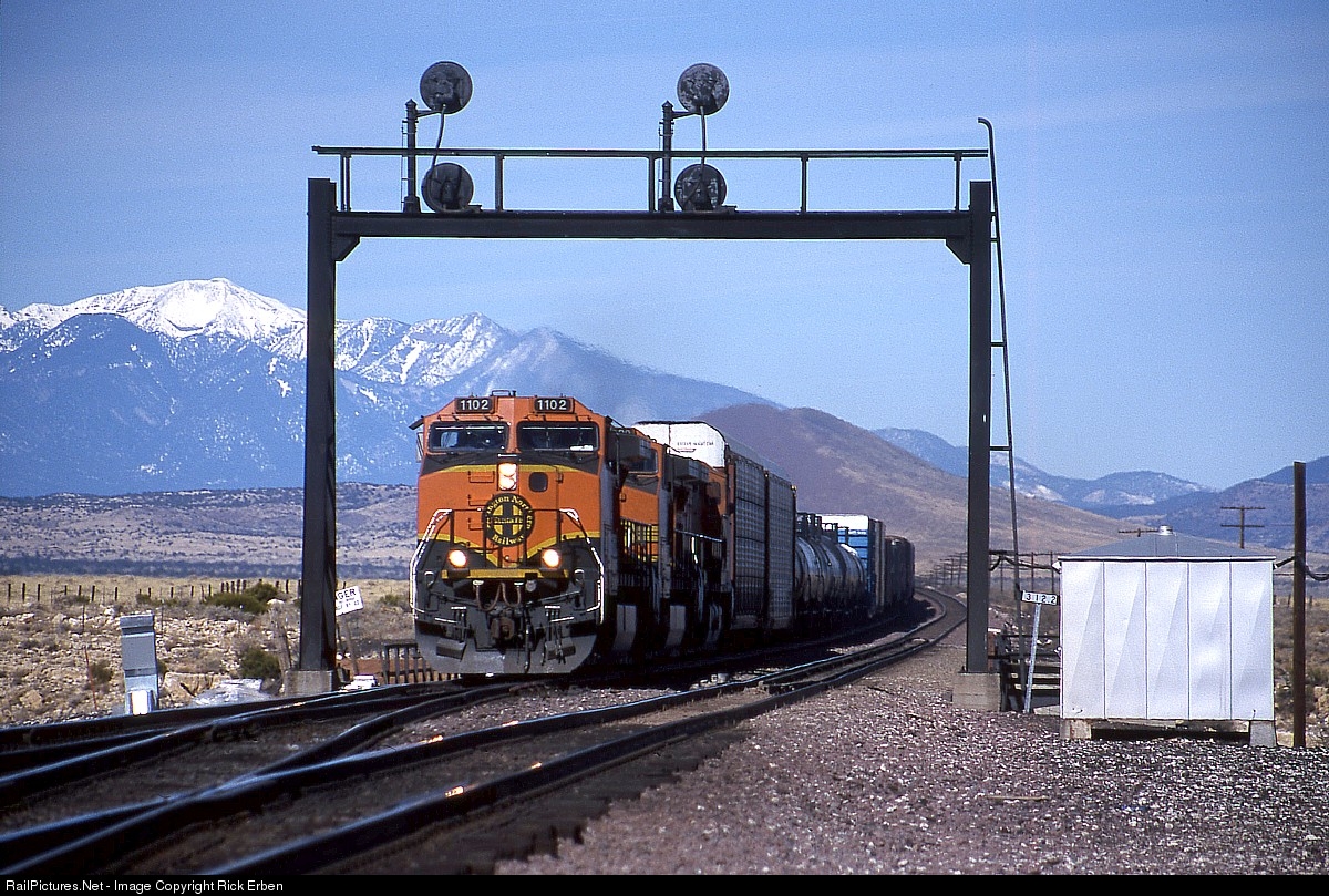 In a land of contrasts, this eastbound has been visible for a while; seemingly in slow motion as it crosses the vast plains. As it nears its speed becomes evident then all of a sudden the 1102 with 94 cars comes rumbling across Canyon Diablo and beneath the Santa Fe era signals - that are sorely missed. Fuji Astia.