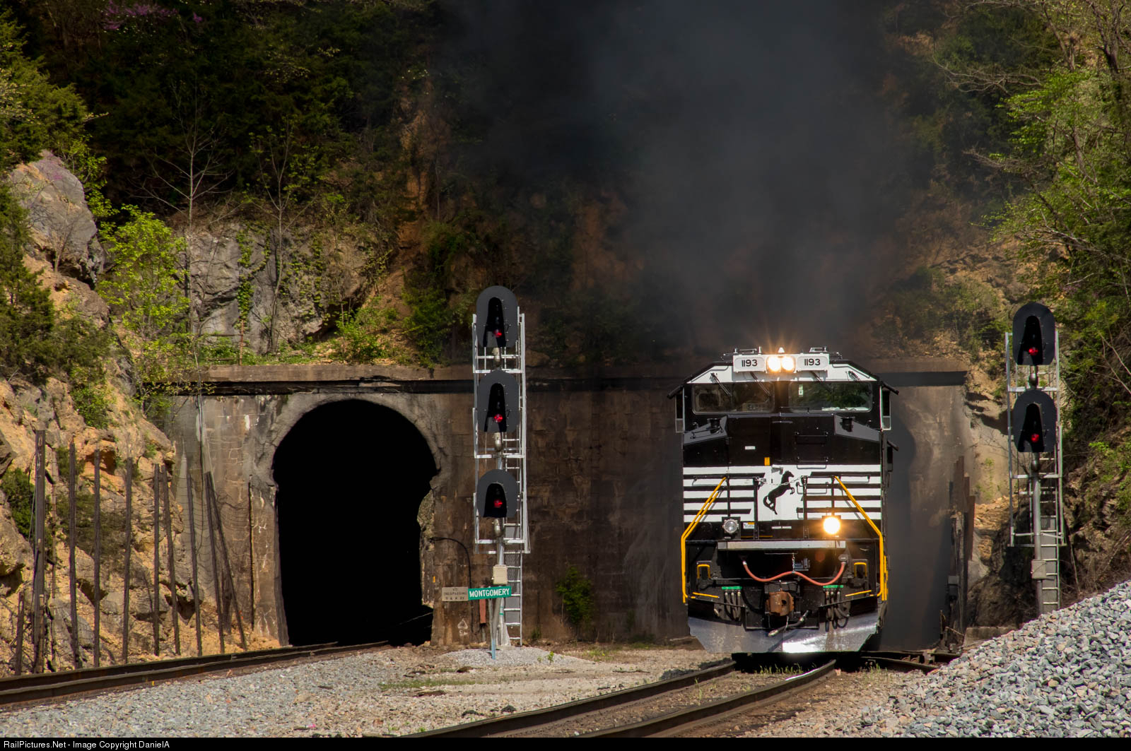 | I was asked by a guy in a car driving by the tunnel if the N&W 611 was coming, I said no. If he had stayed for the show he may have thought I was lying at first. A brand new SD70ACe emerges out of Montgomery tunnel leading NS 29G looking like a steam engine or an old Alco. The train was at a crawl at this point having obvious issues. |