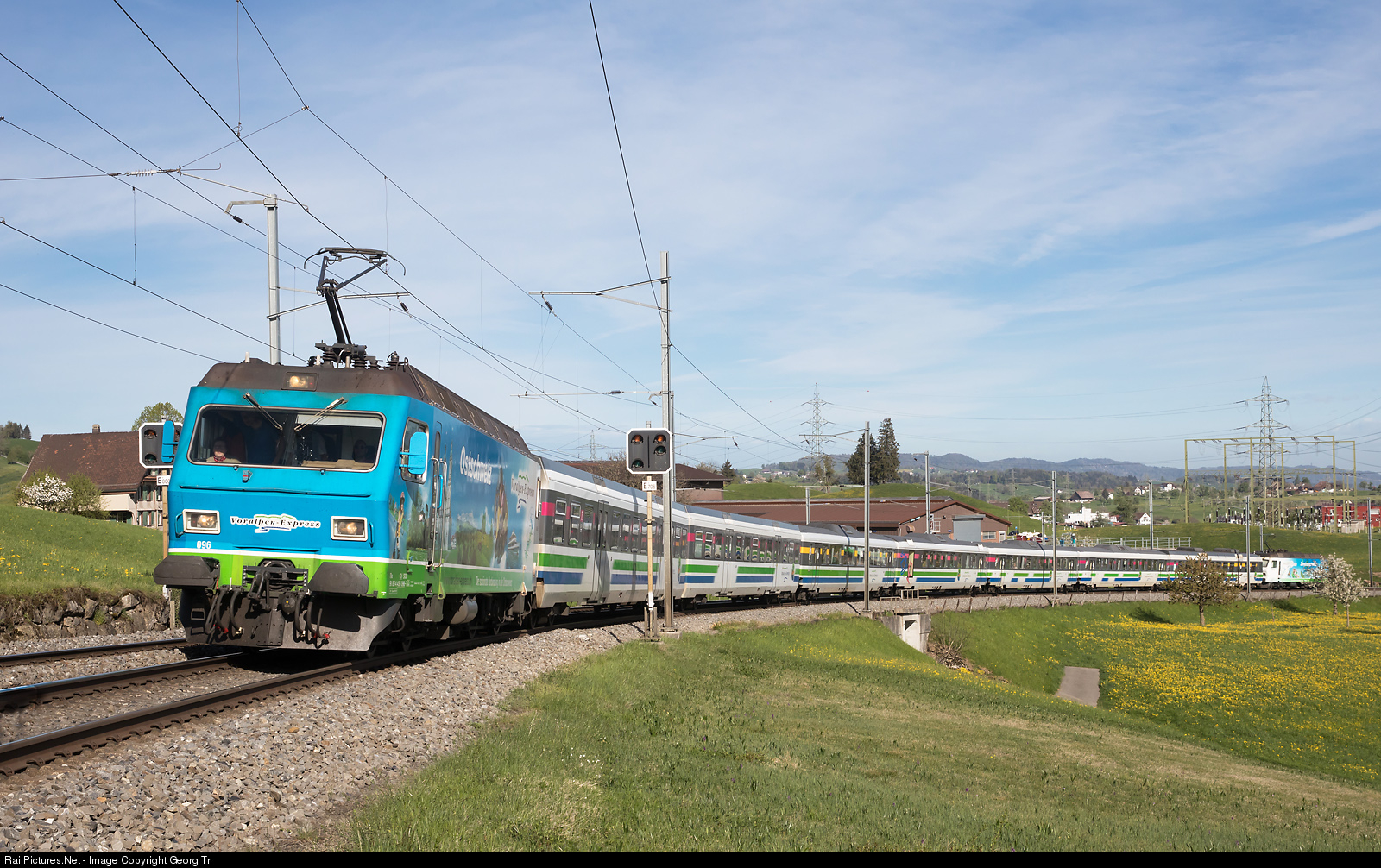 | Re 456 # 096 of the Südostbahn (SOB) in special paint scheme "Voralpen-Express Ostschweiz" is pulling the Voralpen-Express VAE 2566 from St.Gallen to Lucerne above Samstagern. In the rear of the push-pull train is Re 456 # 091 in "Voralpen-Express Zentralschweiz" paint scheme. The train is on a grade of 5.0 % up to Schindellegi-Feusisberg and Biberbrugg. |