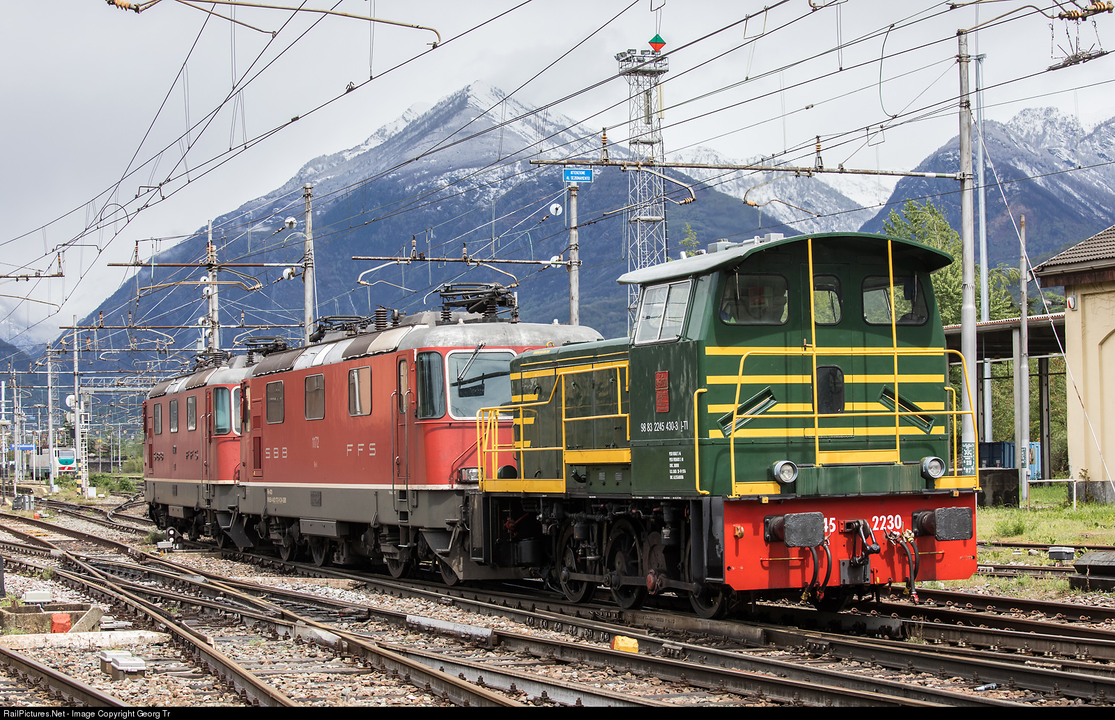 | Diesellocomotive 245 # 2230 (98 83 2245 430-3) of Trenitalia is shunting the SBB locomotives Re 420 # 172 and # 305 at Domodossola. This part of the station is electrified with the italian system of 3000 V DC, so the SBB locomotives arrived from Switzerland with pantographs down when entering the station with the long Venice Simplon-Orient-Express (VSOE) from Basel via Lötschberg and Simplon. |