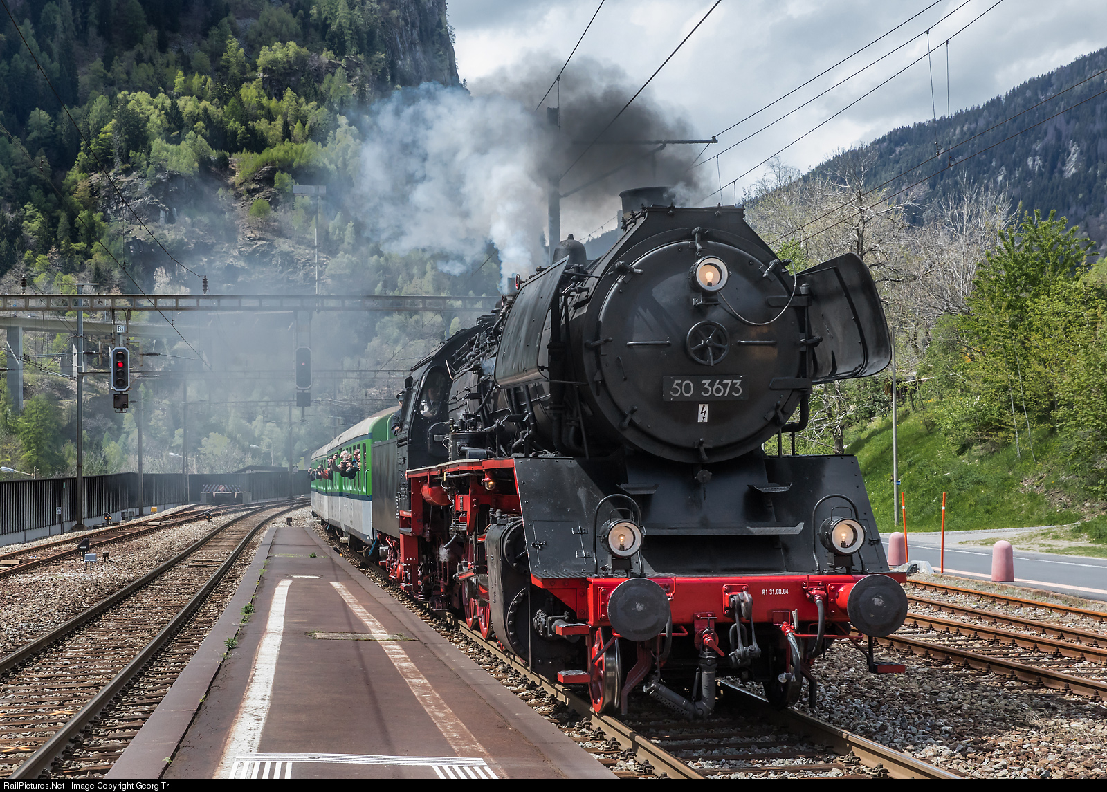 | Steamtrain of association Verbano Express/Luino/Italia running down the Gotthard south ramp between Airolo and Bodio, racing through Faido station with former Deutsche Reichsbahn 2-10-0 freight train locomotive 50 # 3673, now privately owned and based at Luino. The cars are former SBB, then Ferrovia Nord Milano (FNM) lightweight cars from the 1950'. |