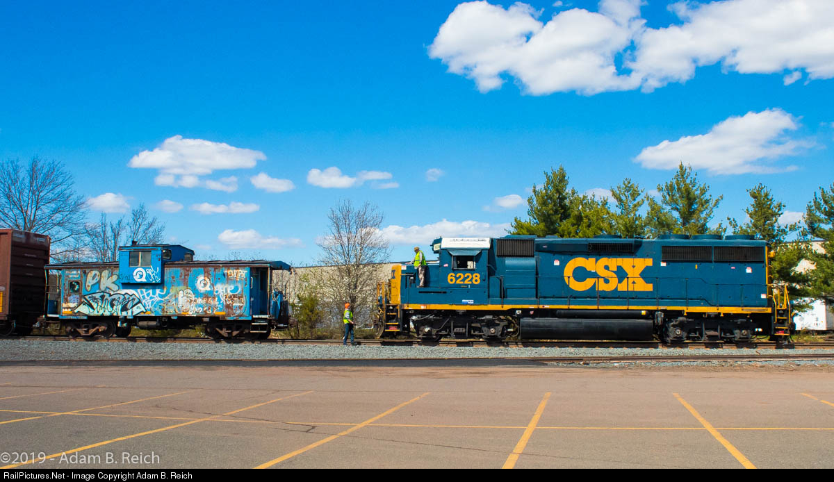 The Run-Around: Crew members on Conrail Shared Assets ME-2 engage in a brief discussion before the engineer couples the locomotive to the rear of the train after running it around the consist on the Millstone Branch on Wednesday April 10, 2019. Photo taken from the Jersey Avenue Station daily parking lot.