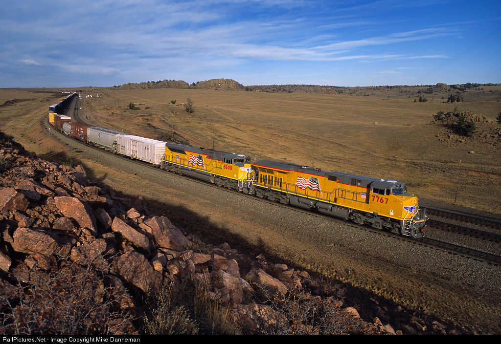 A pair of brand-new locomotives are DPU power for a westbound Union Pacific freight coming off Track 3 at Dale Junction while climbing over Sherman Hill on the morning of October 16, 2007. One each from builders GE and EMD are represented by GE ES44AC No. 7767 and EMD SD70ACe No. 8600.