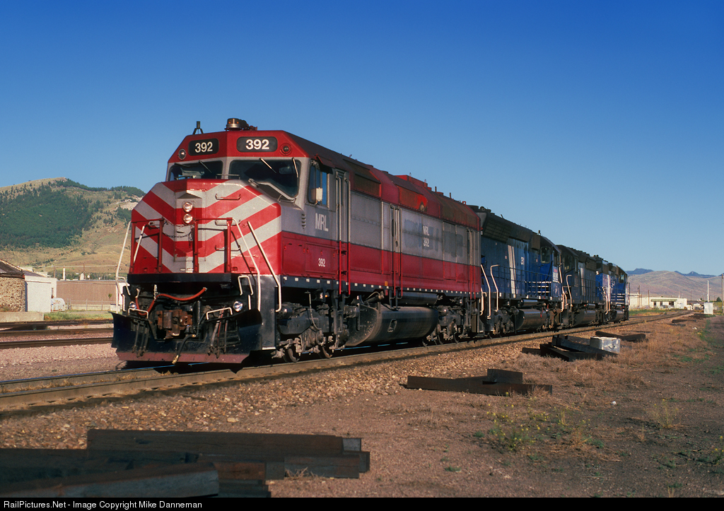Former Wisconsin & Southern F45 No. 1002, now Montana Rail Link No. 392, leads a helper set into Helena, Montana, after pushing a train over Mullan Pass on July 4, 1994. Before a short life on WSOR, No. 392 was Transcisco No. 1002, NRE No. 6642, and was built new as No. 6642 for the Burlington Northern in May 1971.