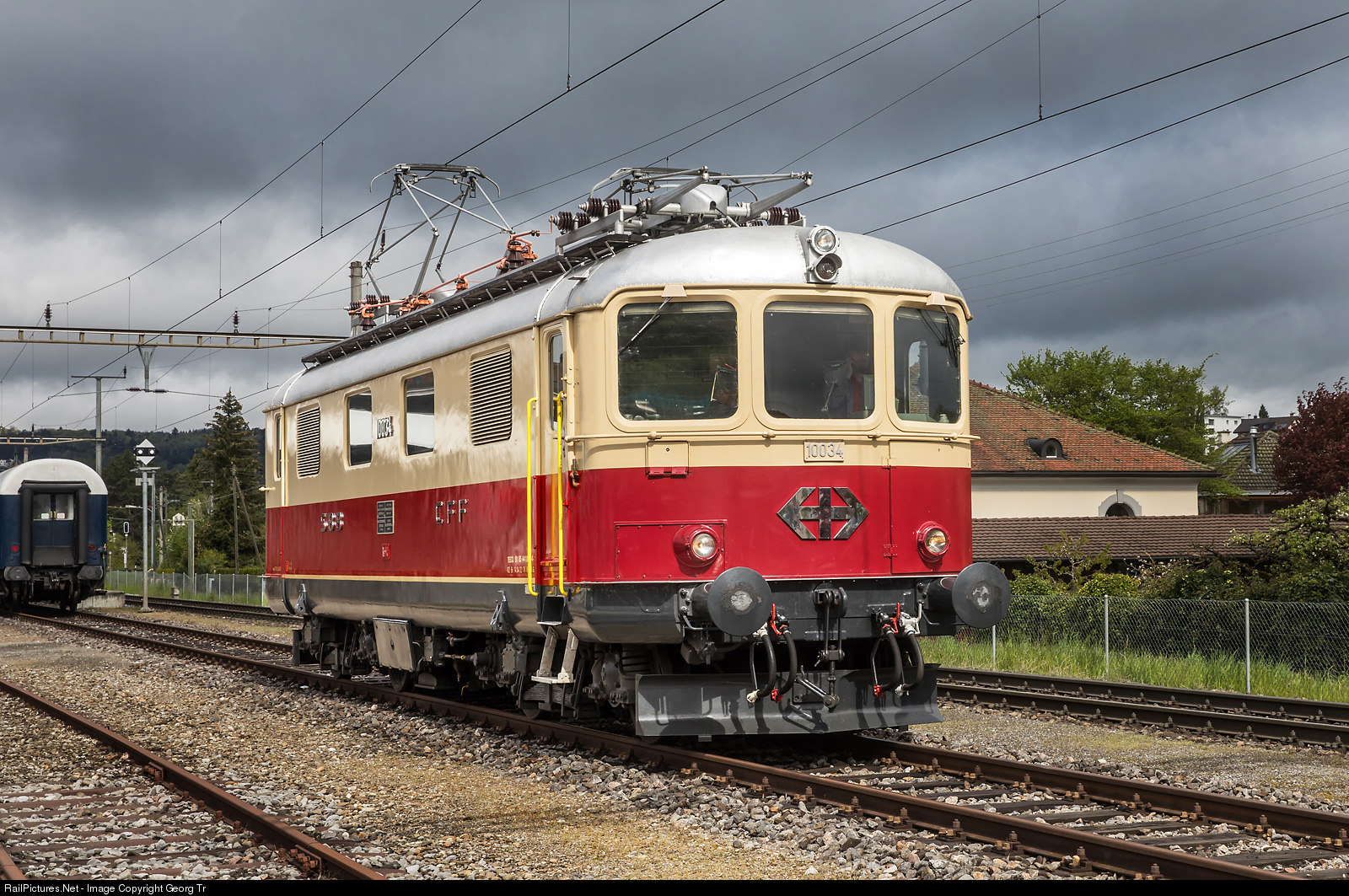 | Re 4/4 I # 10034 of association "TEE Classics" (privately owned) at Feuerthalen with a charter train. The former SBB express train locomotive was built in 1951 by SLM, BBC, MFO and SAAS as # 434 in green color with 1900 kW and 125 km/h maximum velocity. In 1962 renumbered to # 10034. From 1972 to 1987 in the red/cream TRANS EUROP EXPRESS colors for the traction of the TEE Bavaria between Zürich and Lindau. From 1987 in red color and withdrawn in 2004, in the last time used as "wash locomotive" in Basel (shunting cars through the cleaning plant). Then sold and since 2009 running for TEE CLASSICS in the red/cream paint scheme again. |
