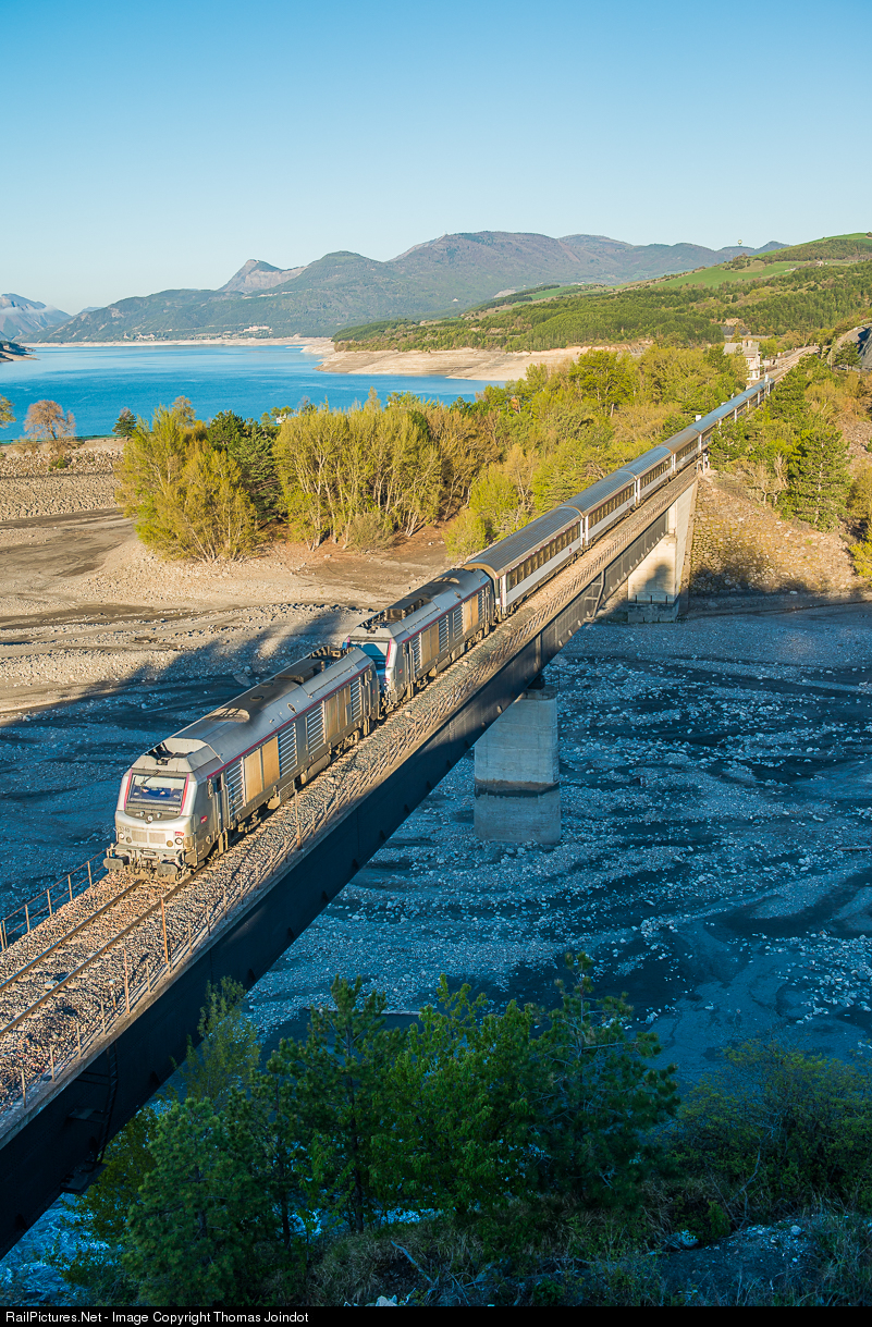 | Thanks to a little 10 minutes delay, the sun had just risen over the Réallon viaduct as the overnight Intercity Paris-Briançon crosses it after having passed Savines station |