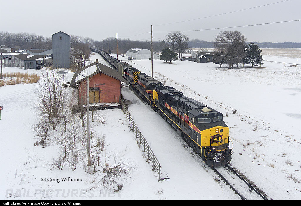 | The South Amana to Cedar Rapids turn job had 2 38's and 2 GEVO's for their daily trek to Cedar Rapids and back. Here the job passes the old depot at Amana on the Cedar Rapids Sub on their way south in 3x1 DP setup. In a few miles the job will pull by at Yocum Connection and shove into the South Amana Yard to conventionalize the power, setout power, and pickup freight for the job to run to Silvis this afternoon. This is old ex-Milwaukee Road trackage that once ran from Cedar Rapids south towards Ottumwa. |