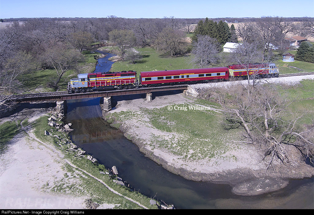 | The Iowa Northern ran a passenger special out of Waterloo on Good Friday. The trip went from Bryant Yard in Waterloo to the end of the property at Cedar Rapids for investors and accountants. The IANR had the equipment looking nice and clean! Here the job deadheads back to Waterloo as they cross Rock Creek a few miles south of LaPorte City. It is kind of rare to get good light northbounds on this end of the line, as normal operations tend to run at night. |