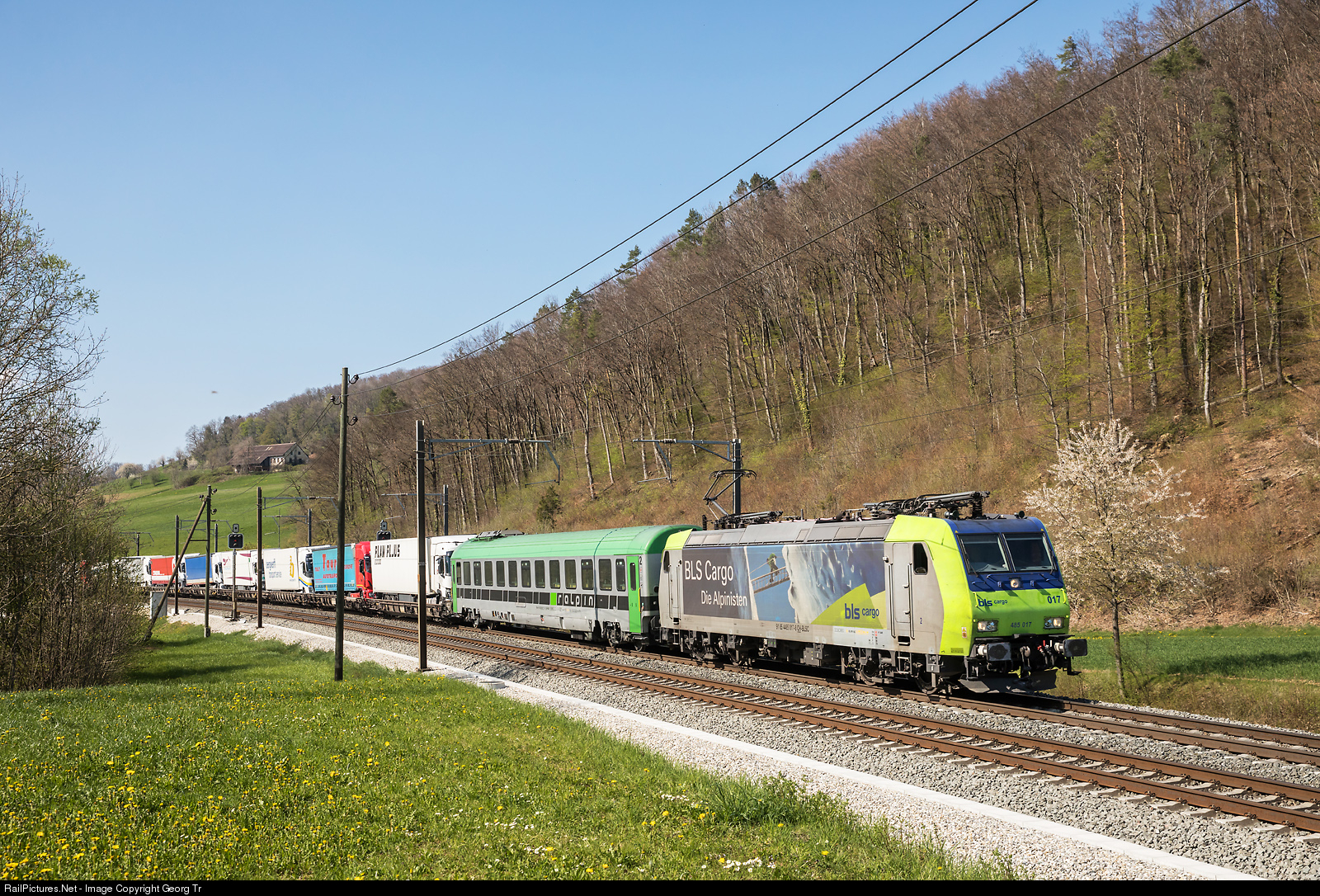 | Bombardier TRAXX F140 AC1 Re 485 # 017, built in 2004, is pulling the RAlpin rolling highway train 43625 from Freibiurg im Breisgau via Basel-Lötschberg-Simplon to Novara Boschetto, on the Hauenstein line between Gelterkinden and Tecknau. |