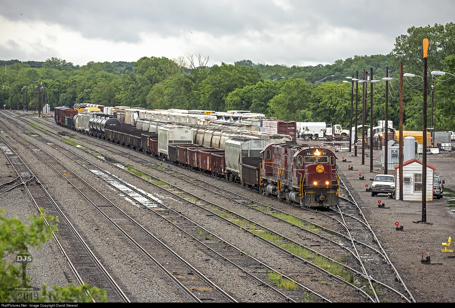 | It's a wet and dreary day at Van Buren, Arkansas as A&M's Ft Smith Local retrieves the day's cars from UP with it's pair of immaculate Alco C420s. |