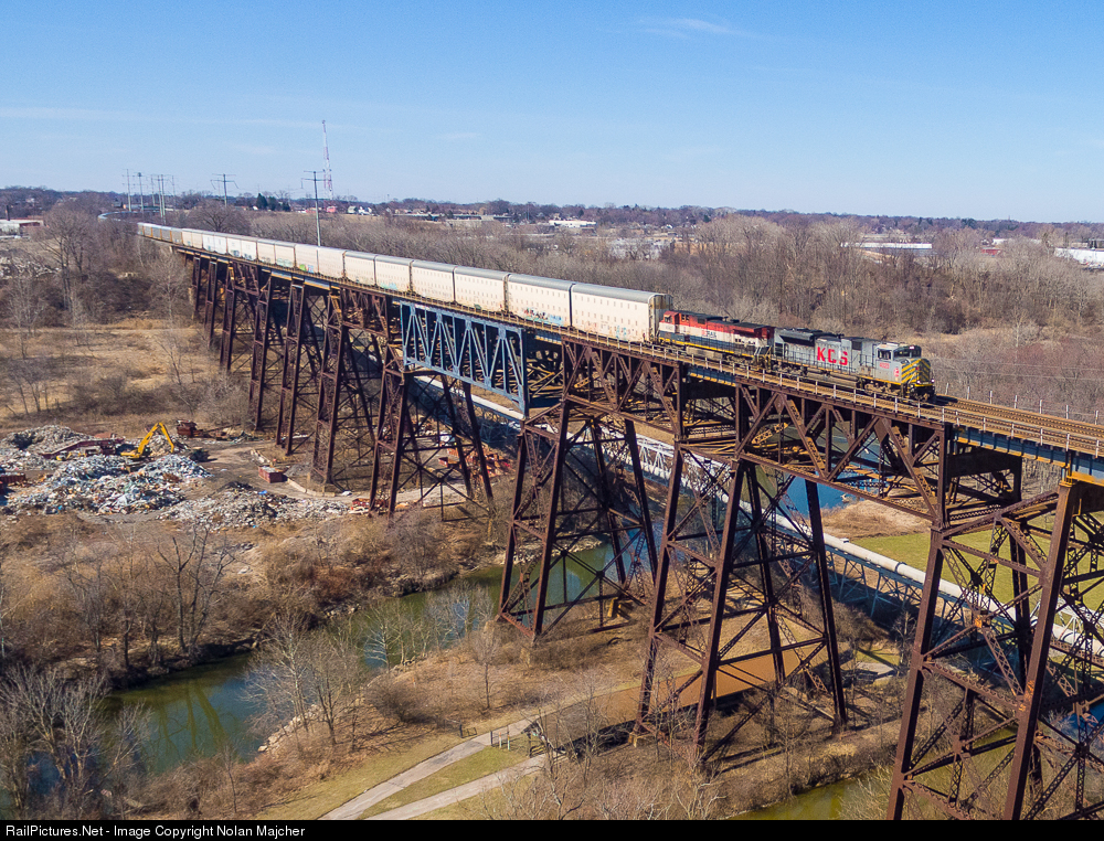 Loaded vehicle train Q262 is eastbound on CSX's Short Line Sub and is seen soaring over the Cuyahoga River Valley on Marcy Trestle in Cuyahoga Heights, Ohio with the increasingly famous KCS/BCOL duo leading the way. This pair of units has been delighting fans across the northern half of CSX's system for nearly three weeks and are a welcome sight amidst the parade of Gevos that can usually be seen here.