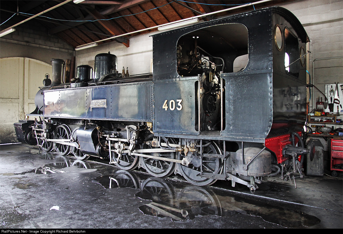 | Mallet steam locomotive 403, built in 1903 by SLM Winterthur, is waiting in the shed for the next train. |