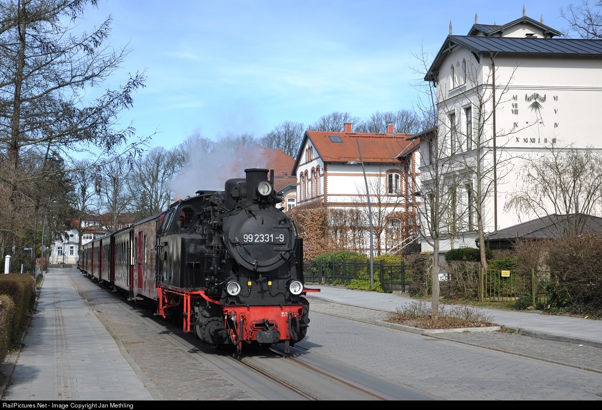In Bad Doberan the Molli-trains run on public streets, seen here Molli's small locomotive 99 2331-9 on a train in the Goethe-street. This direction is easier for the loco-driver! In the other direction the cars come against the train! Not every car-driver knows, what to do then ...