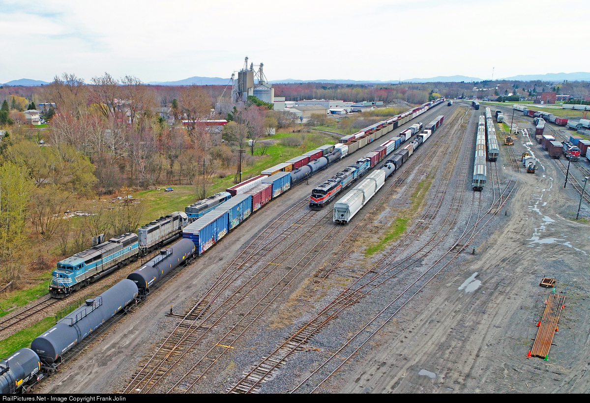 Central Maine & Quebec 9011 North disturbs the peace of a quiet Sunday morning as it passes through Farnham Yard on the mainline.