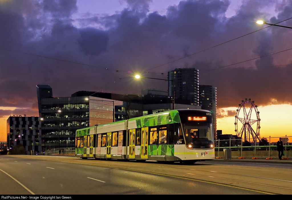 E class tram 6054 races across the La Trobe Street bridge on the route 86 to Bundoora at sunset.