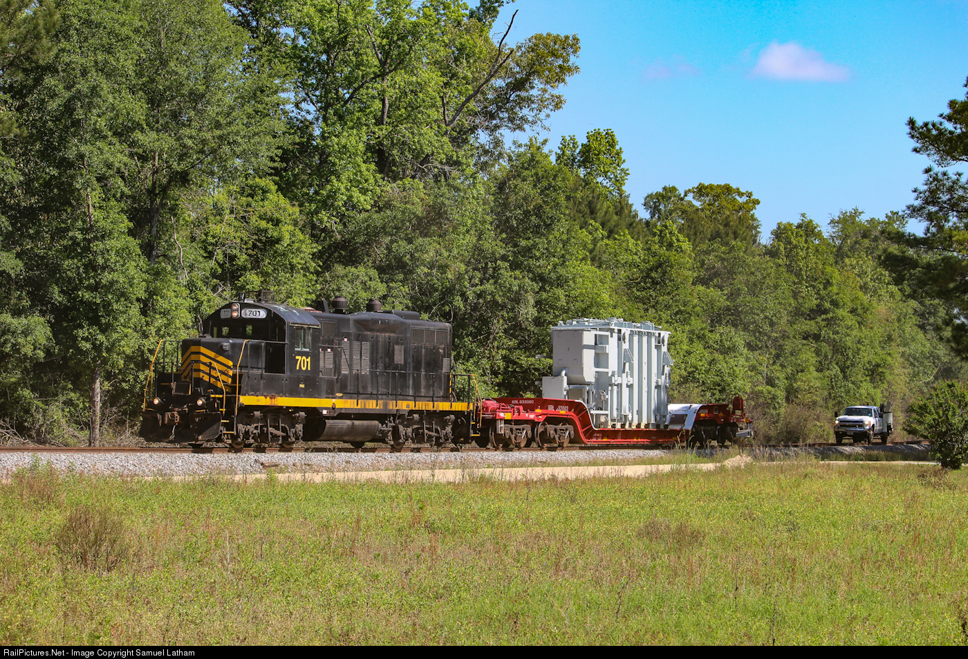 PREX GP7 701 eases the high and wide transformer load around a curve on the 85 pound jointed rail on the former Central of Georgia Statesboro Branch. This is the first time in history this type of movement would happen. The 701 would later break down in Statesboro and would need a rescue from the other road engines. |