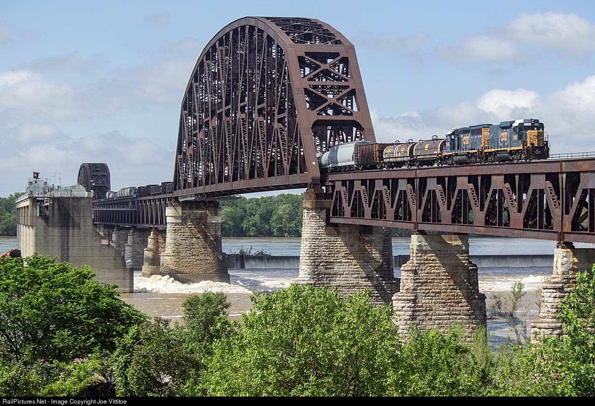 CSX local Y129 crosses the Ohio River into Indiana where it will work industries at the Jeffersonville maritime center. Road slug 2256 was built as GM&O GP30 508.