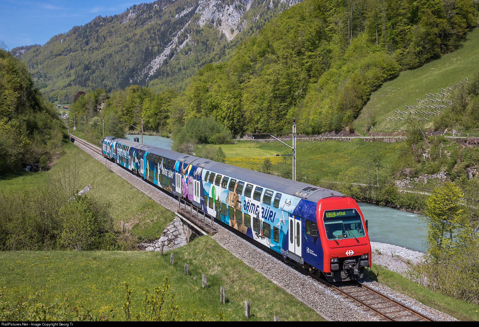 | Doubledeck commuter train "DPZ" withlocomotive Re 450 # 016 in the rear is running the S 25 service 20551 from Zürich to Linthal along the Linth between Ennenda and Mitlödi. This train got a new publicity paint scheme (adhesives) for 150 years Zürcher Kantonalbank (bank of the canton Zürich) on march 1st 2019. The design "Zäme Züri" (Zürich together) was made by Nadine Geissbühler and should stay for 3 years. |