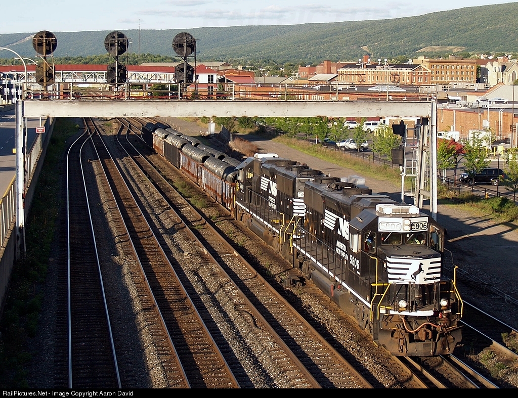 | NS local C52 accelerates through Alto Interlocking in downtown Altoona and under the old signal bridge guarding the east end of this interlocking. This signal bridge would later be removed as Alto interlocking was completely redone by NS several years later and a new signal bridge was built just west of the photographer's vantage point. |