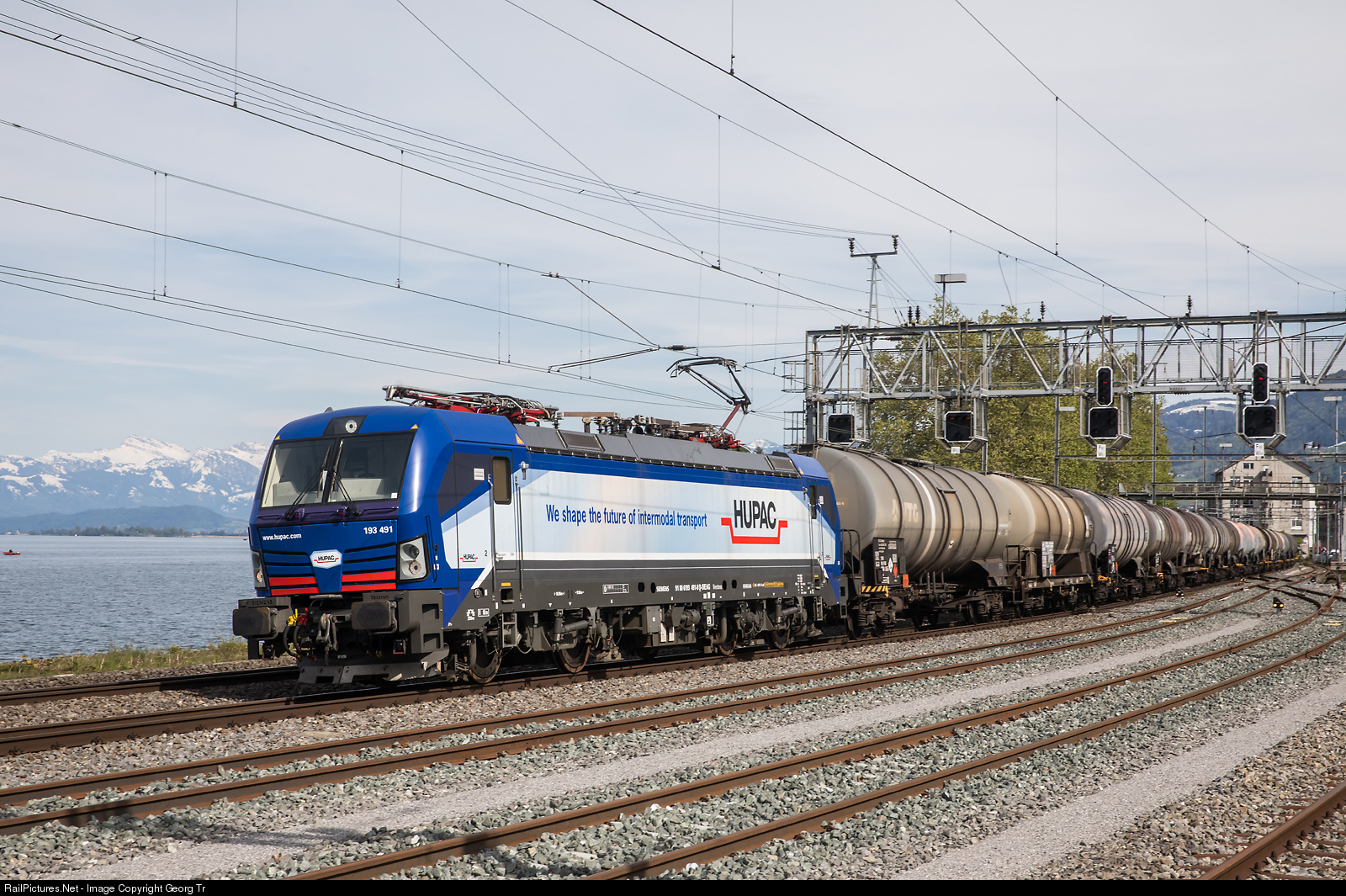 Siemens "Vectron" 193 # 491 of the Hupac company, rented to Widmer Rail Services AG (WRS), is pulling the empty tank car train 69658 from Salez-Sennwald via Sargans-Olten-Biel to Cornaux, running through Wädenswil on the shore of Lake Zürich.
