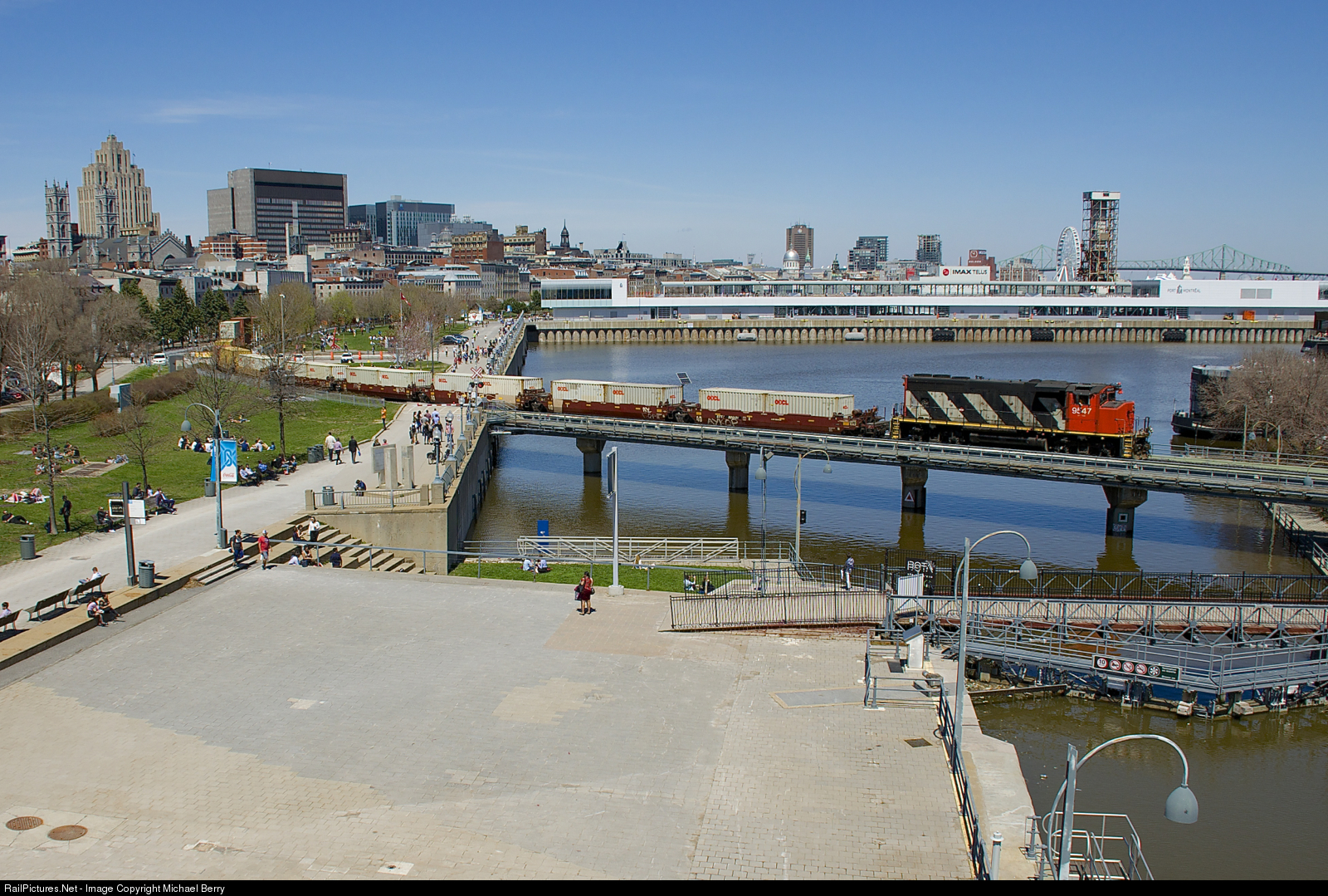 CN 9547 has 37 cars (mostly intermodal) as it exits the Port of Montreal during a busy lunchtime.