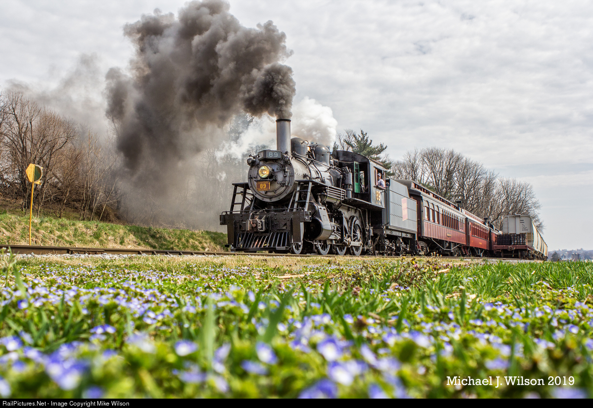 | "Shades of Spring": SRC #89 shuffles by the freight cars stored in the Groff's Grove siding as patches of violet-colored wildflowers begin to pop up out of the ground signaling a change in season for the Road to Paradise. |