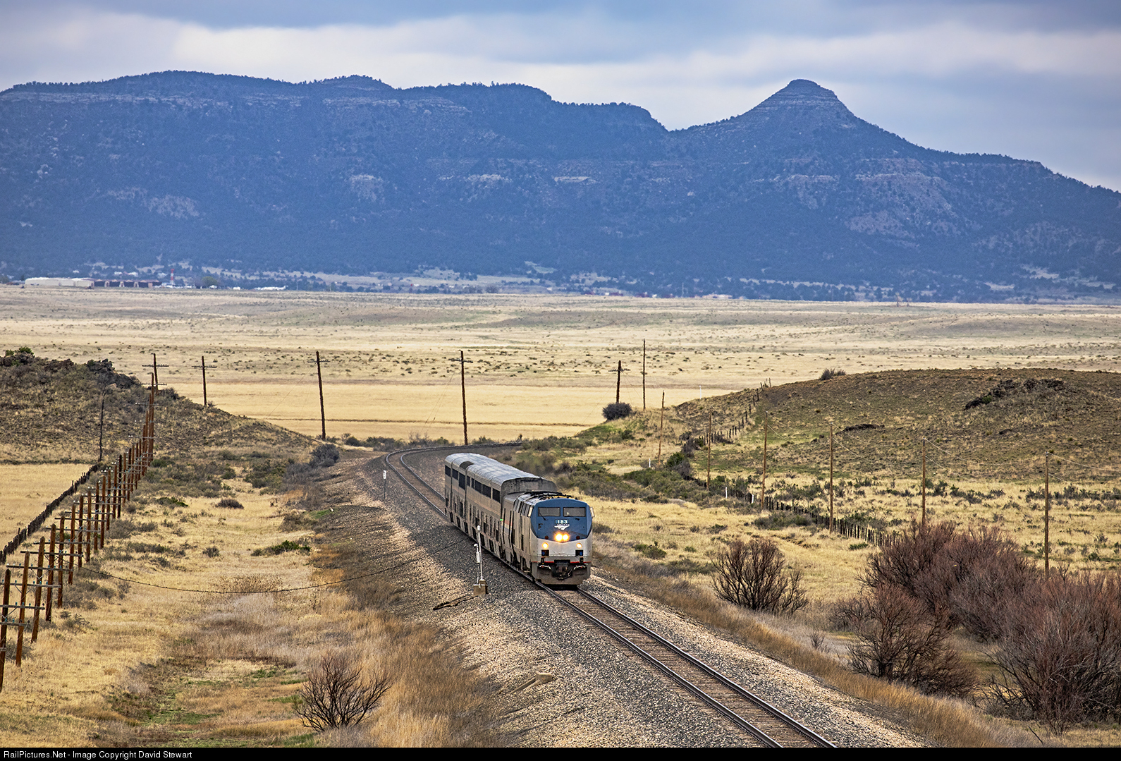 With Raton Pass and the station stop of Raton at the markers, Amtrak's Southwest Chief, train No3 bound for Los Angeles continues it's journey through the scenic southwest as it makes the posted speed of 79mph several miles north of Maxwell, New Mexico on May 2, 2019.