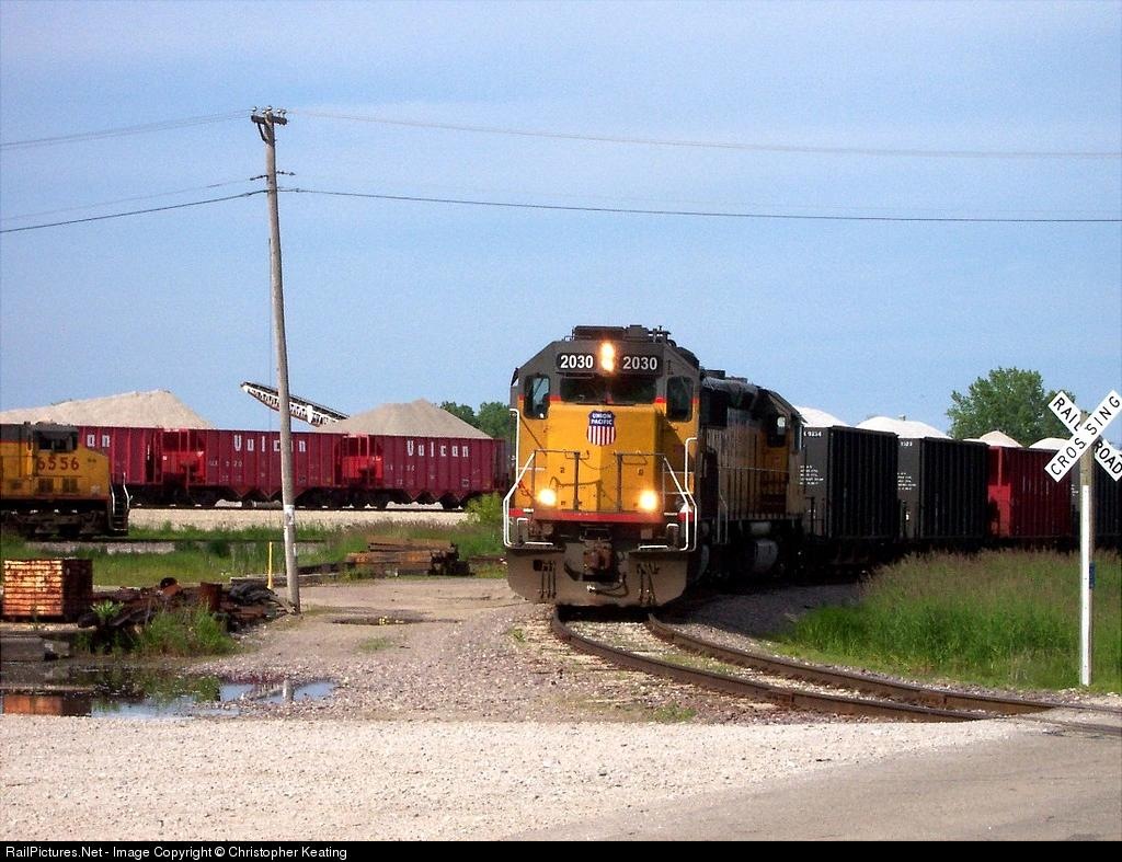 | Affectionately dubbed "The Rock Train," UP's RIVUP is always a good bet to see in the Kenosha area, due to its usually on-time schedule. Here it is preparing to head south onto the Milwaukee Sub towards Upton. |