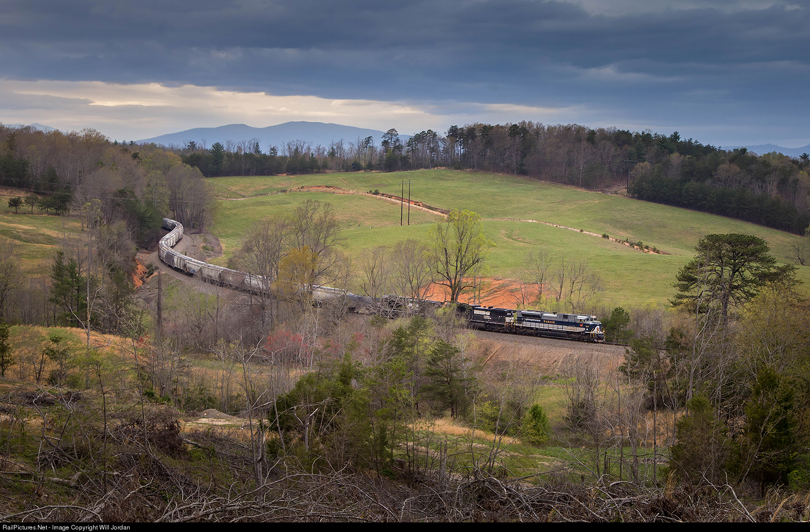 NS 123 winds through the rolling farmlands of North Carolina's foothills with the Wabash heritage unit in charge.