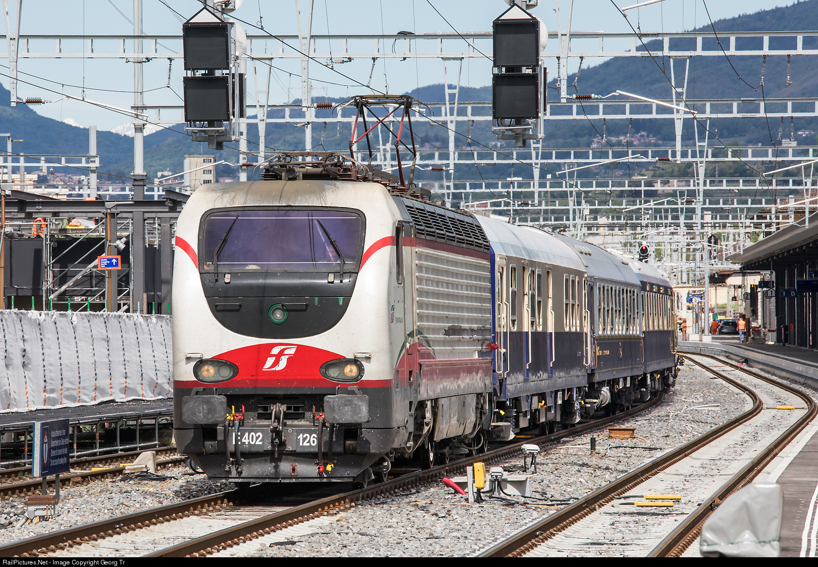 Locomotive E 402B # 126 of Trenitalia in the "Frecciabianca" paint scheme is leaving the swiss/italian border station Chiasso with the 10 car "Golden Eagle Danube" luxury train bound for Como S.G. The train is on the 11 day "Grand Alpin Express" journey from Budapest (Hungary) via Vienna, the Semmering pass, Lake Achen, Innsbruck, Zürich, the Gotthard mountain line, Chiasso, Lake Como, Milan, Lake Garda, Verona, Trieste, Lake Bled and Ljubljana (Slovenia) to Venice. The most expensive is a single in the Superior Deluxe Class for 30195 USD (or 26495 Euro), but really all inclusive.