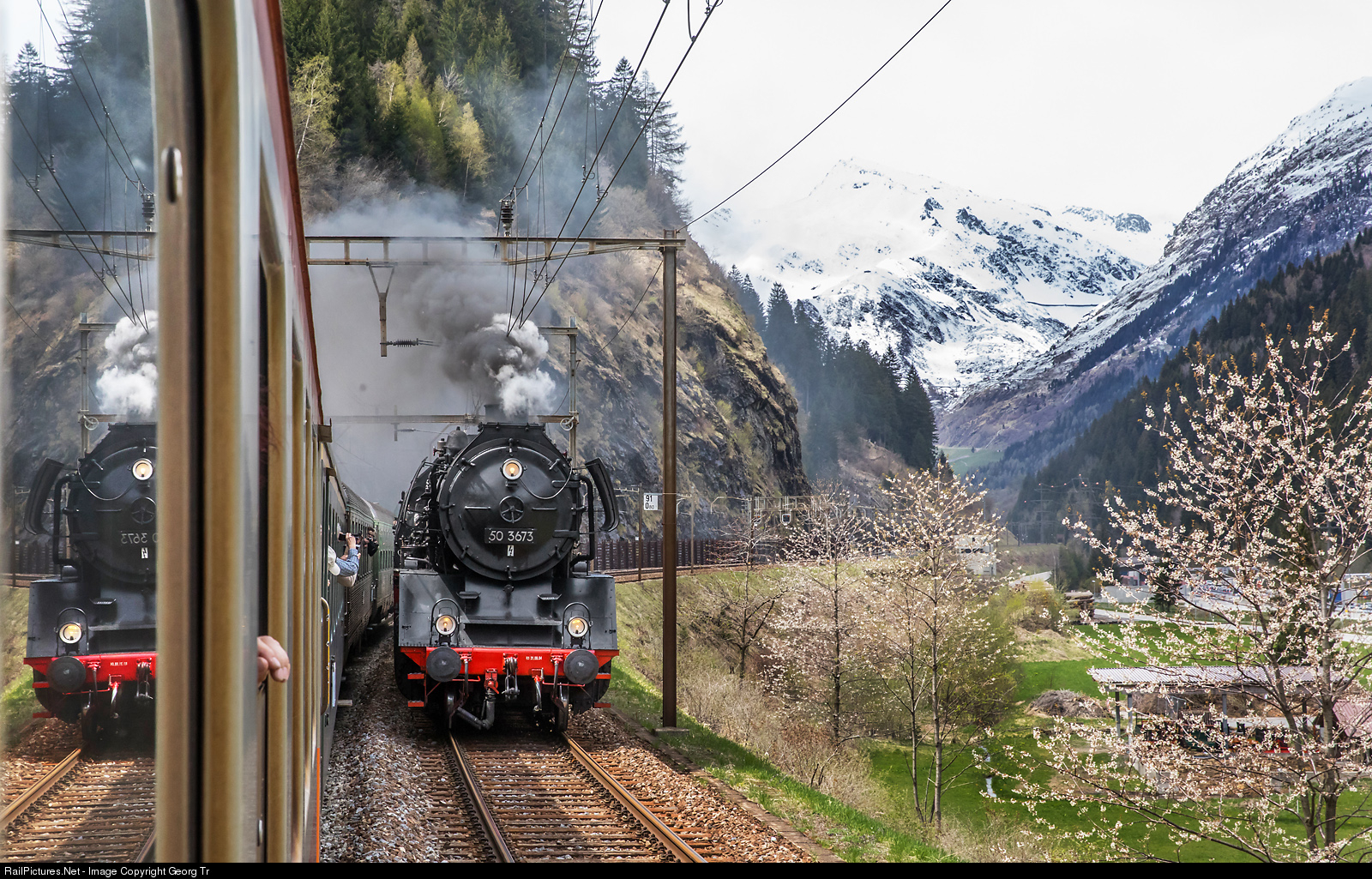 | Parallel run of two passenger trains down the Gotthard south ramp between Airolo and Ambri-Piotta. Viewed from the Eurovapor train with locomotives Ae 6/6 # 11407 of association Mikado 1244 and former austrian railway 1020 # 042, the steamtrain with 2-10-0 50 # 3673 (privately owned and operated by association Verbano Express at Luino/Italy) was photographed. In the rear of the train on the left side are two former french railway SNCF INOX "Mistral" cars, built in 1963 by Carél et Fouché. One is a second class seat cars, the other a bistro/bar car, both owned by "Verein 1020.042". |