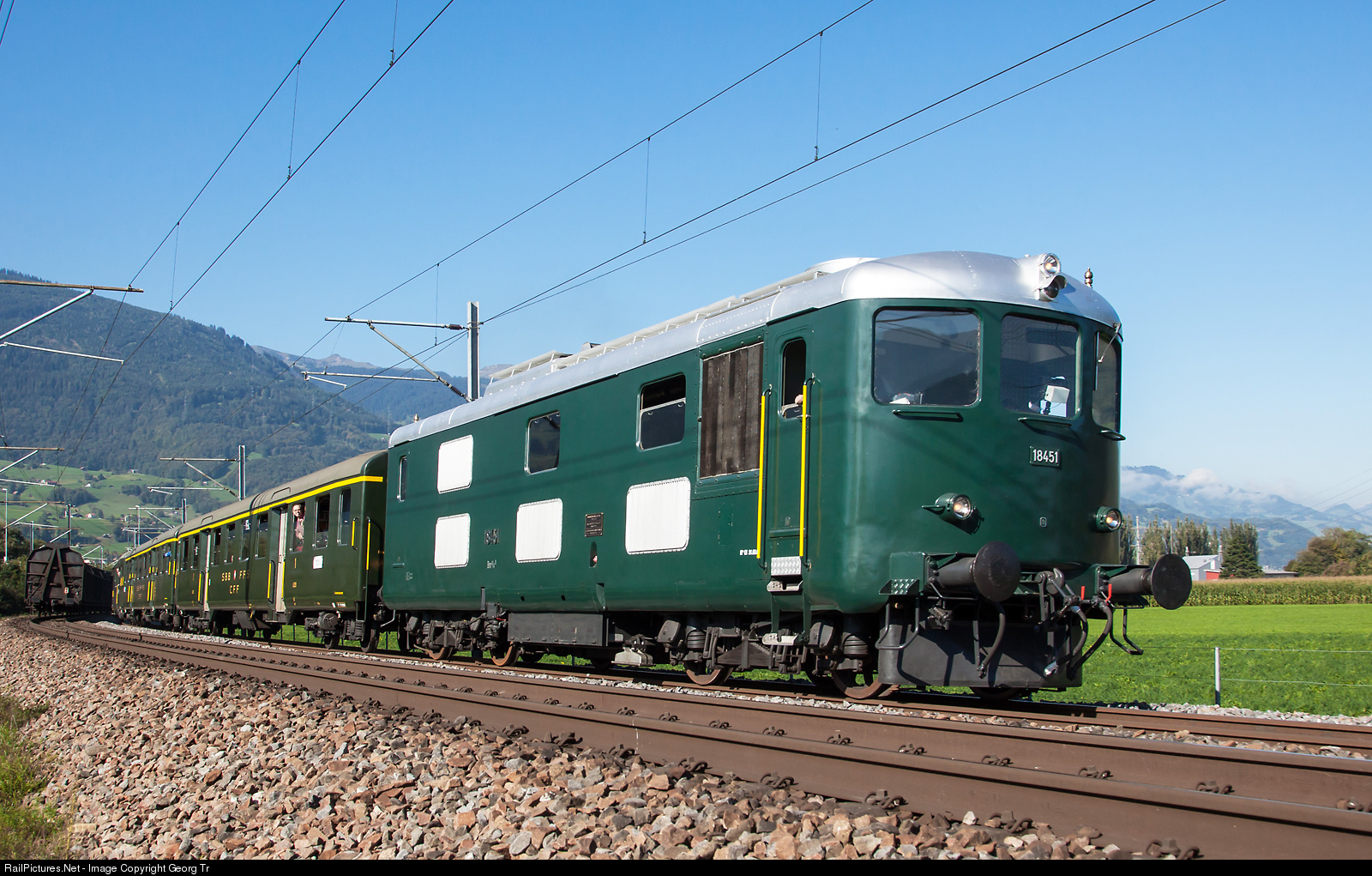 One of the most interesting and least frequently used locomotive of SBB Historic is diesel locomotive Bm 4/4 II # 18451 from 1939, based at Olten. With three Leichststahlwagen (lightweight cars) it is running on a charter trip for english railfans between Sargans and Trübbach. The locomotive was built, together with a sister locomotive, as Am 4/4 # 1001 and # 1002 by SLM, Brown Boveri Company and Sulzer for the SBB. The four-stroke, eight-cylinder Sulzer diesel engine with 880 kW power brought the very lightly-built locomotive (only 16 tons axle load) to a maximum speed of 110 km / h. In 1963, the two locomotives got new gearboxes, the top speed was reduced to 75 km/h, the tractive power increased. They were then labelled Bm 4/4 II # 18451 and # 18452. Locomotive # 18452 was scrapped in 1990, # 18451 is historic locomotive in Olten and its original Sulzer diesel engine from 1939 received a fully overhaul a few years ago.