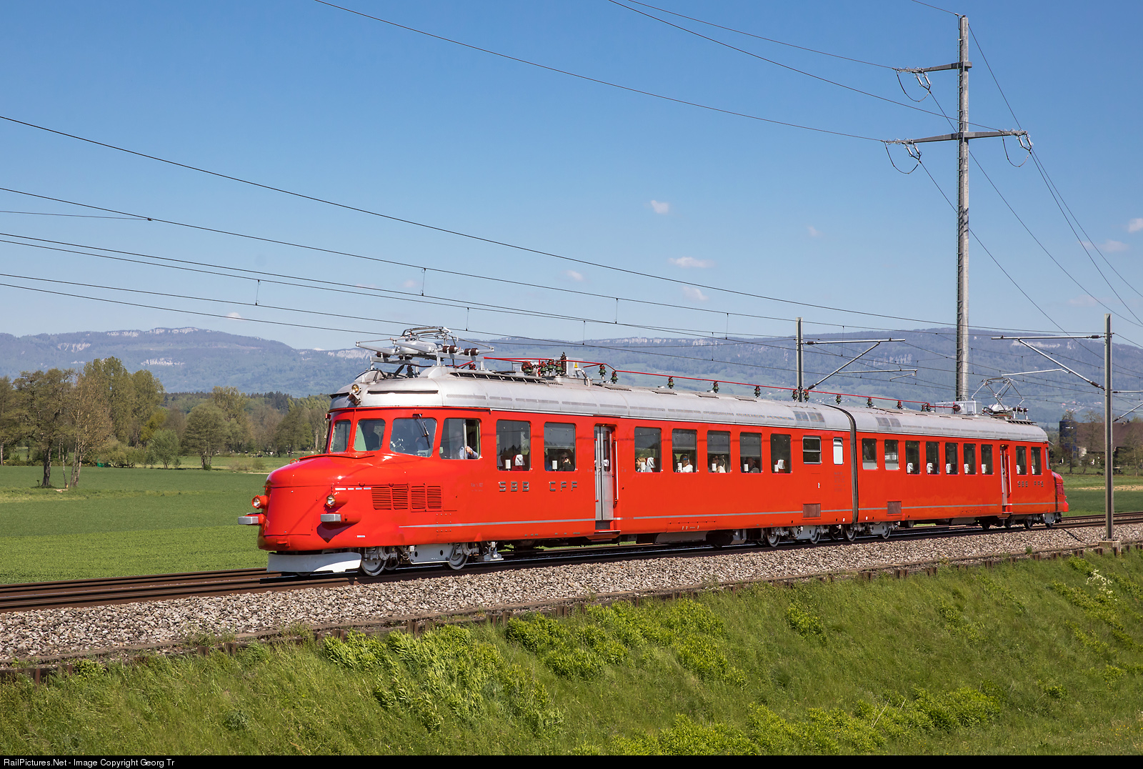 The double red arrow RAe 4/8 # 1021 of the SBB is 80 years old now. This elegant railcar was built in 1939 as Re 4/8 # 301 by SLM, SWS, BBC, MFO and SAAS for leisure journeys and exhibited at the Landesausstellung (National exhibition 1939). It was very few used during WW II, but in 1946, when Sir Winston Churchill visited Switzerland, it served for several trips of the former british prime minister. Since this time, the double red arrow is better known as "Churchill Pfeil" (Churchill Arrow). The maximum velocity is 150 km/h, an exceptional value at the time and thus the fastest SBB vehicle then. Today the maximum speed is limited to 125 km/h and for reasons of comfort it is driven in the 100 km/h range. From december 2018 to april 2019, the vintage vehicle got a large revision at the IW (industrial plant) Biel of the SBB and is now like new for the next years. The bogies and rail scrapers are now painted in a light grey shade and underline the elegance of the vehicle. The iconic "Churchill Pfeil" (the inscription on the train is "roter Pfeil Churchill" since a few years) with 112 first class seats at tables is on a charter run for a US company from Lucerne via Zofingen-Burgdorf-Berne-Fribourg to Lausanne near Bollodingen, between Herzogenbuchsee and Riedtwil. The engineer, who recognized the photographer from far, opened the window, waved and blow the whistle.
