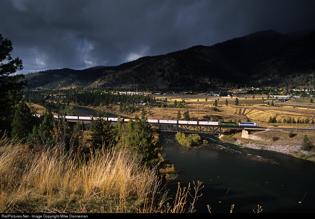 Under a stormy Montana sky, a BNSF freight train crosses the Clark Fork bridge at Bonner on October 4, 2005, heading eastbound on Montana Rail Link’s Third Subdivision between Missoula and Helena.