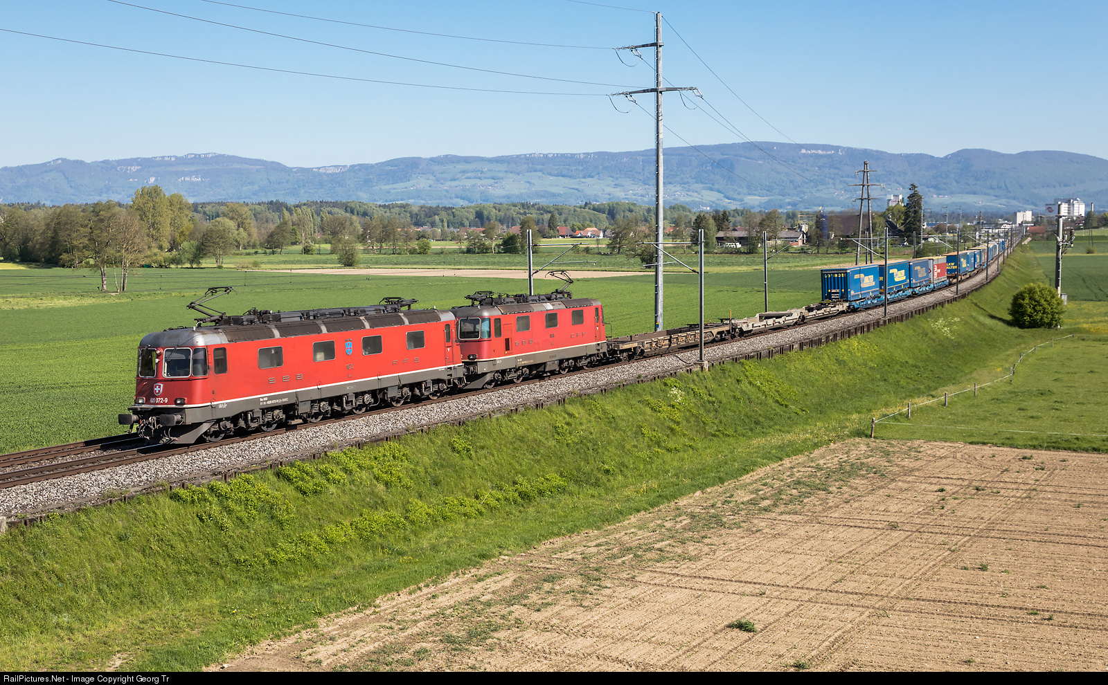 A "classic" red "Re 10/10" of the SBB, Re 620 # 072 "Balerna" and Re 420 # 335 (Re 4/4 II 11335) in multiple traction, is pulling southbound "Simplon Intermodal" train 63501 from Basel shunting yard field D (BRBD) to Domodossola 2 shunting yard, near Bollodingen between Herzogenbuchsee and Riedtwil.