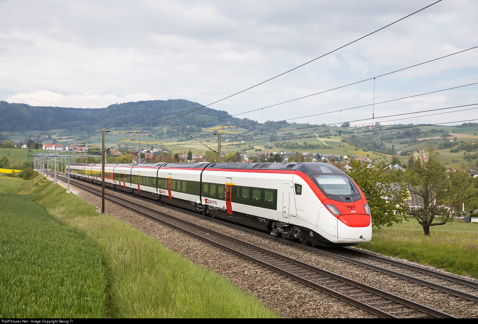 | RABe 501 # 006 "Giruno" from StadlerRail for the SBB is in timetabled service since a few days. The highspeed train is running as Interregio 2067 from Basel via Brugg (AG)-Baden-Zürich to Zürich Airport, between Frick and Hornussen on the Bözberg line. |