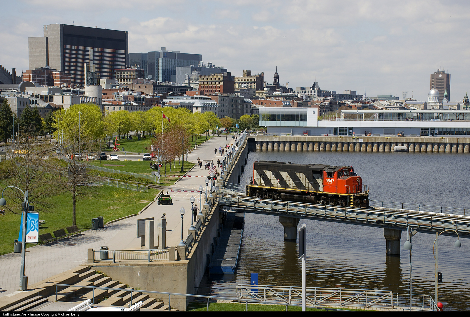 After bringing a long transfer into the Port of Montreal, CN 9547 is leaving light power as it crosses a bridge over the eastern end of the Lachine Canal.