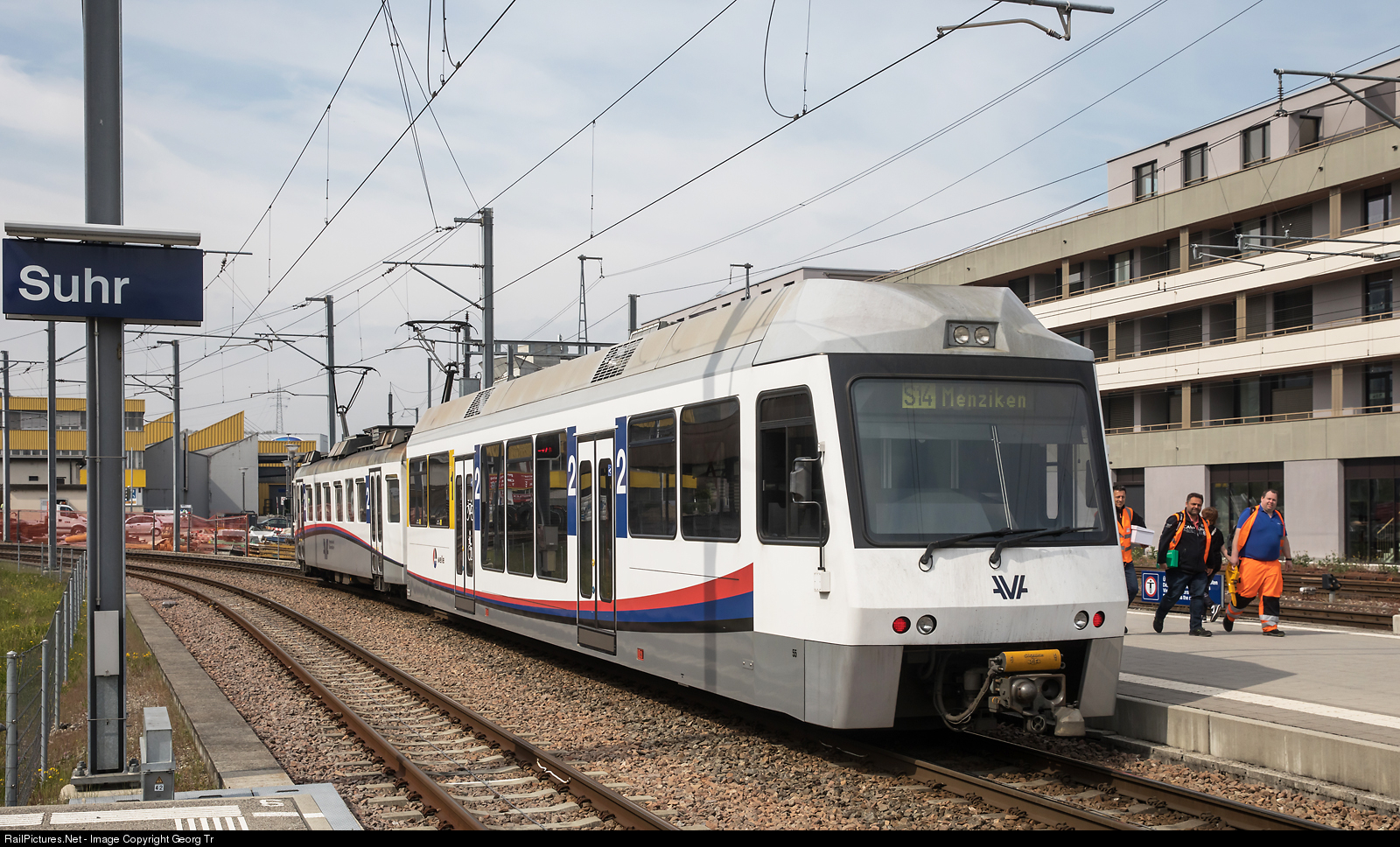 S 14 service of the Aargau Verkehr AG (AVA) is leaving Suhr bound for Menziken, with railcar Be 4/4 # 27 (built 1978/79, modernised 2010) and cab car ABt 55 (StadlerRail 2008/2009).