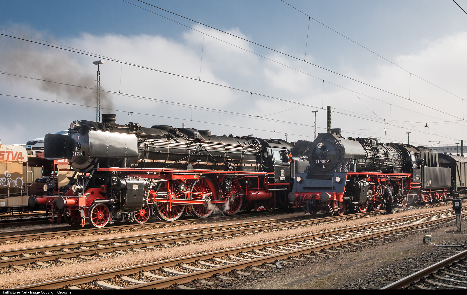 | Meeting of the 4-6-2 express train steamlocomotive 01 # 202 from Lyss/Switzerland with the 2-6-2 passenger steamlocomotive 35 # 1097 of the Interessengemeinschaft Traditionslok 58 3047 e.V. at Glauchau. |
