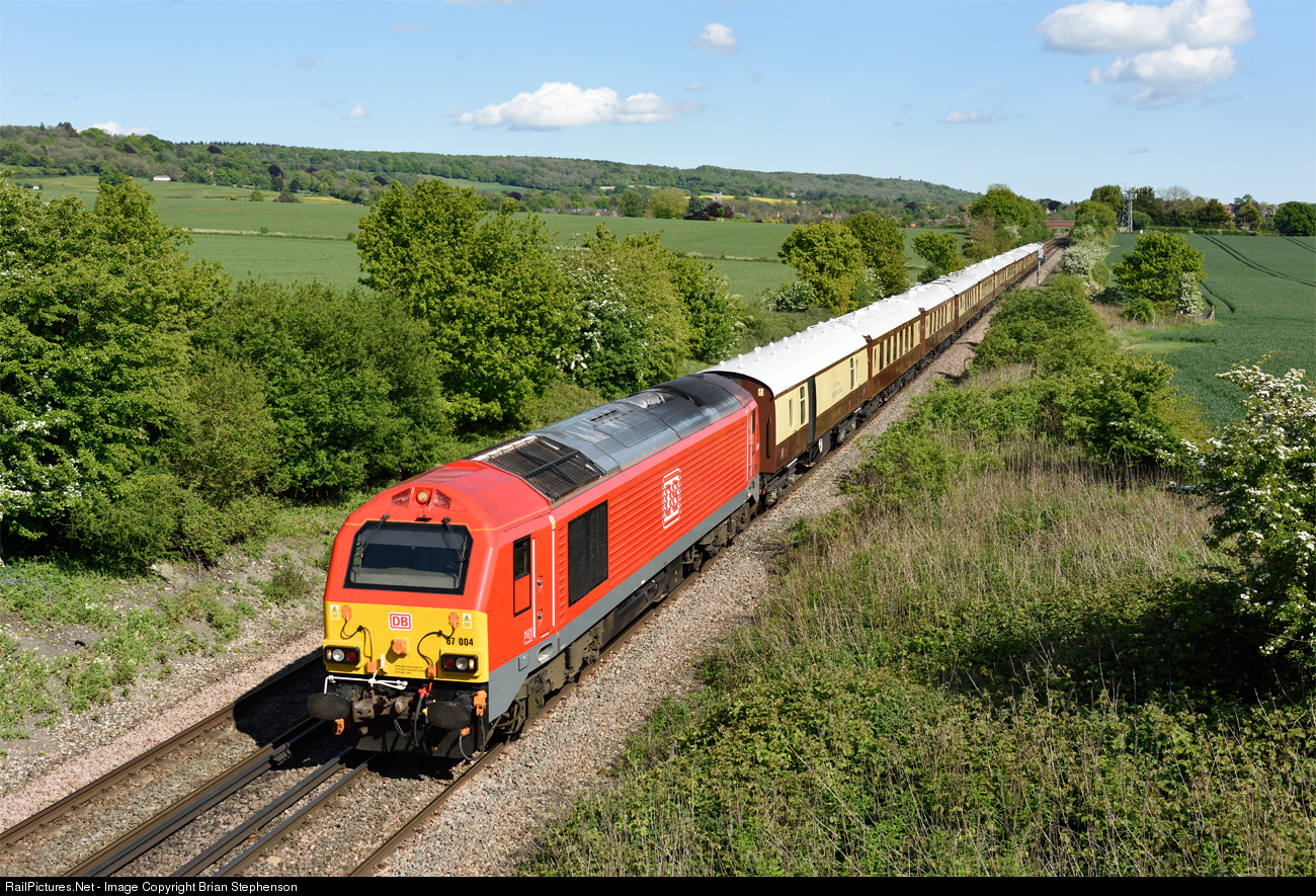| Fresh out of the paint shop, DB Cargo class 67 No 67 004 has just received a coat of DB red seen shortly after passing Charing with the Belmond British Pullman with the the 15.30 Folkestone West to London Victoria train carrying passengers returning from Venice who have travelled through the Channel Tunnel on luxury road coaches from Calais Ville station. |