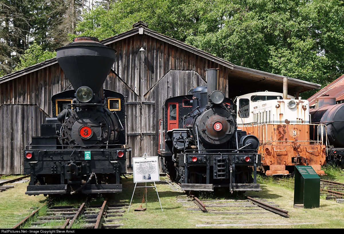 Mayo Lumber No. 3, a 1924 built Lima 50-Ton 2-Truck Shay, Hillcrest Lumber Company No. 9, a 1915 built 50-Ton 2-Truck Climax and British Columbia Forest Products No.9, a Whitcomb Locomotive Works 80-DE-7-B on display at the BC Forest Discovery Centre in Duncan.