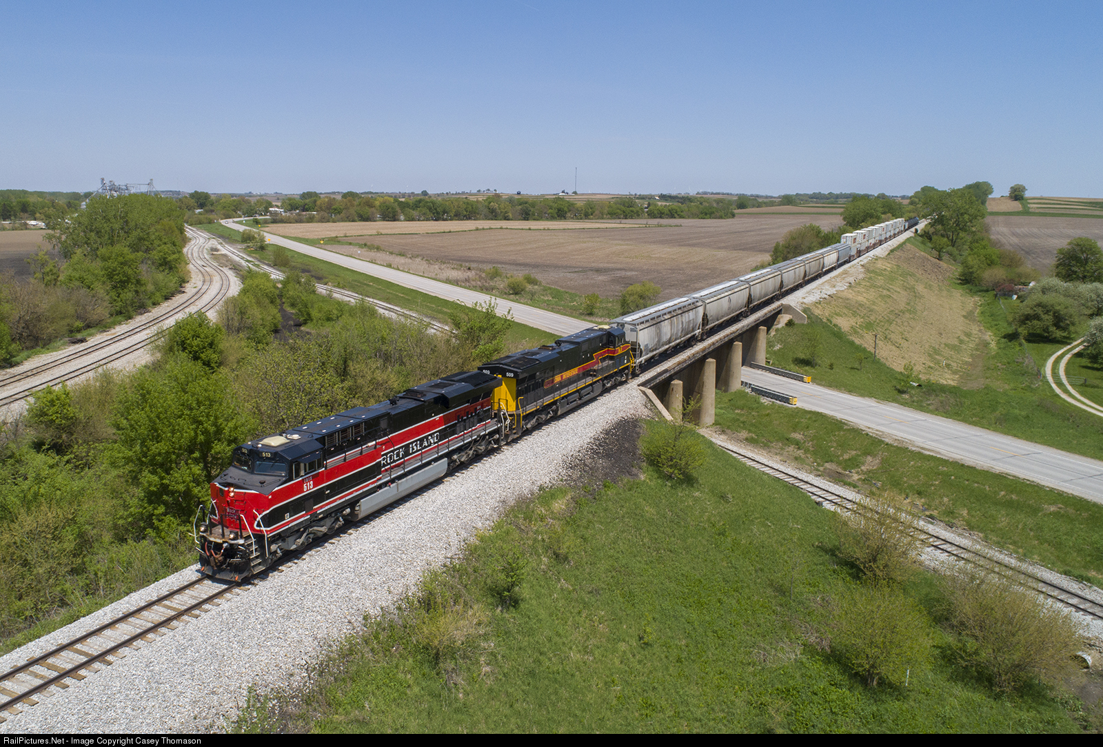 | Iowa Interstate's "Rock Island" heritage unit leads the daily Blue Island to Council Bluffs train through Hancock, Iowa. |