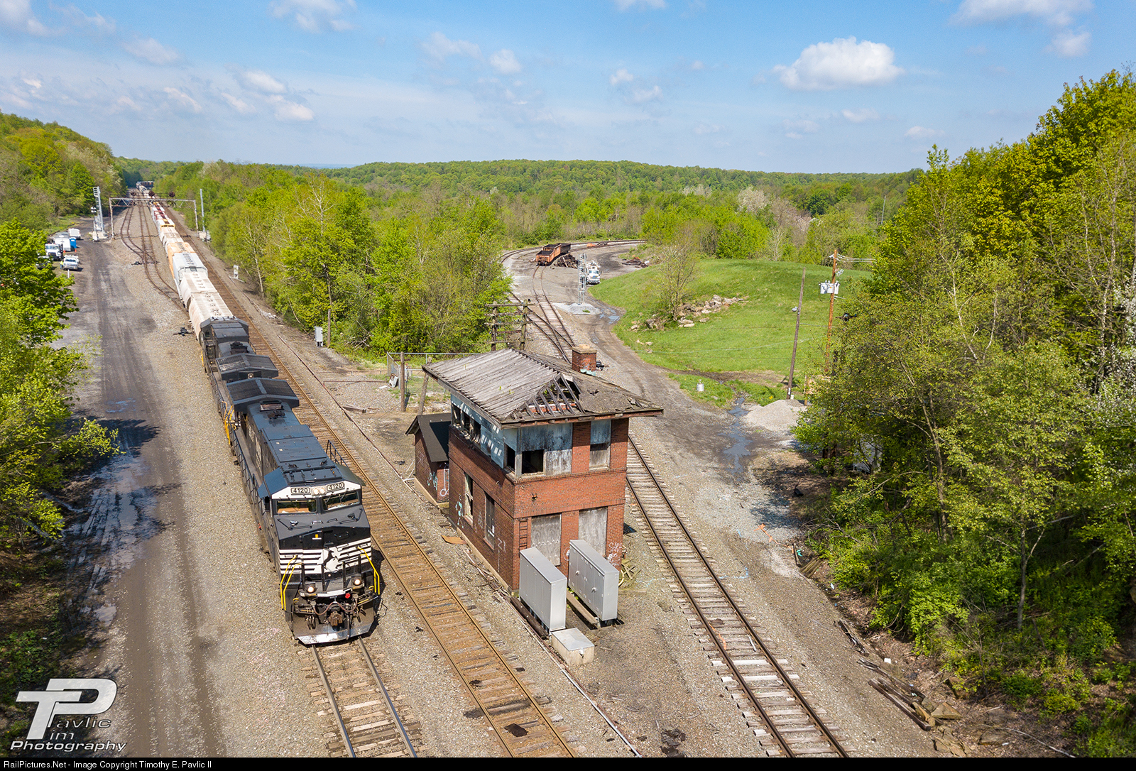 Eastbound mixed freight 16N crawls by AR Tower as it prepares to descend 'The Slide.' The tower, one of three still standing on the mountains between Altoona and Johnstown, is in rough shape. The hip roof (a later addition) is in very poor condition (and covers a intact flat roof) and several windows are either broken out or no longer closed up. It's seen better days, but it's appears to not be in danger of collapsing. There's no word on how much longer NS will let AR stand, but with the PRR signals replaced the following Sunday, it is now the last reminder of the Pennsy at this location.