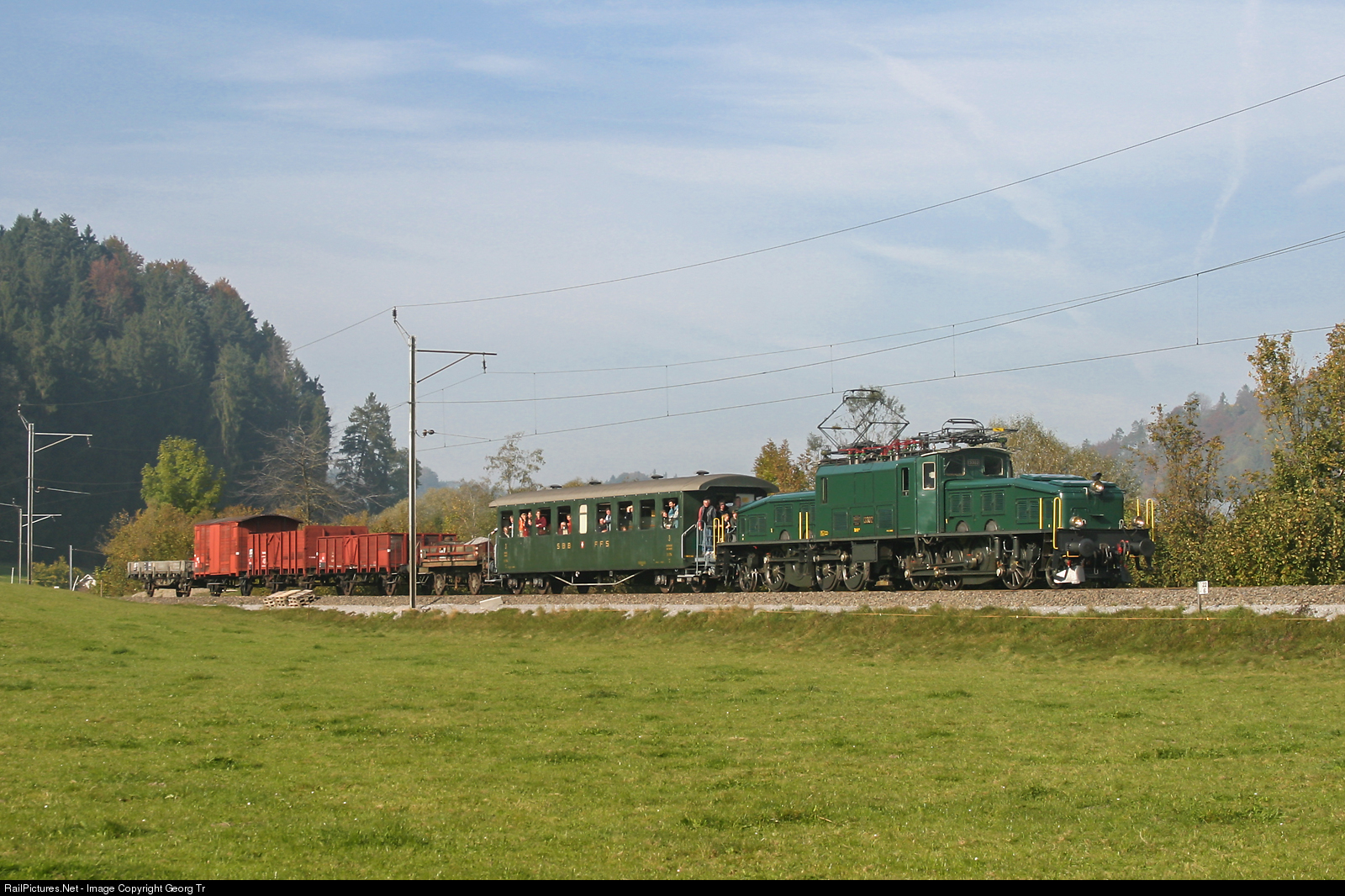 "Crocodile" Be 6/8 III # 13302 of SBB Historic, on long term loan to "Betriebsgruppe 13302" at Rapperswil since 1976, is pulling a nice mixed freight/passenger train between Saland and Bauma, on the occasion of the traditional autumn vehicle meeting, organised by the DVZO.