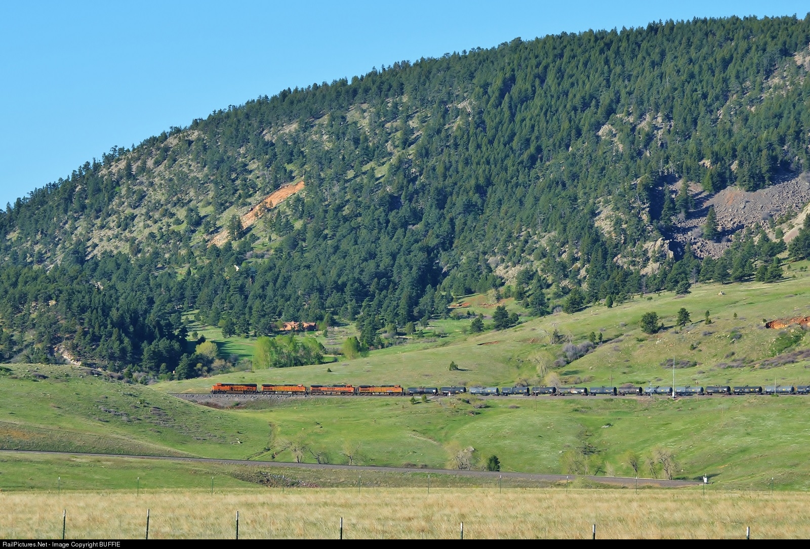BNSF 7933 (ES44C4) heads towards Big Ten Curve after coming out of the Rocky Mountains.