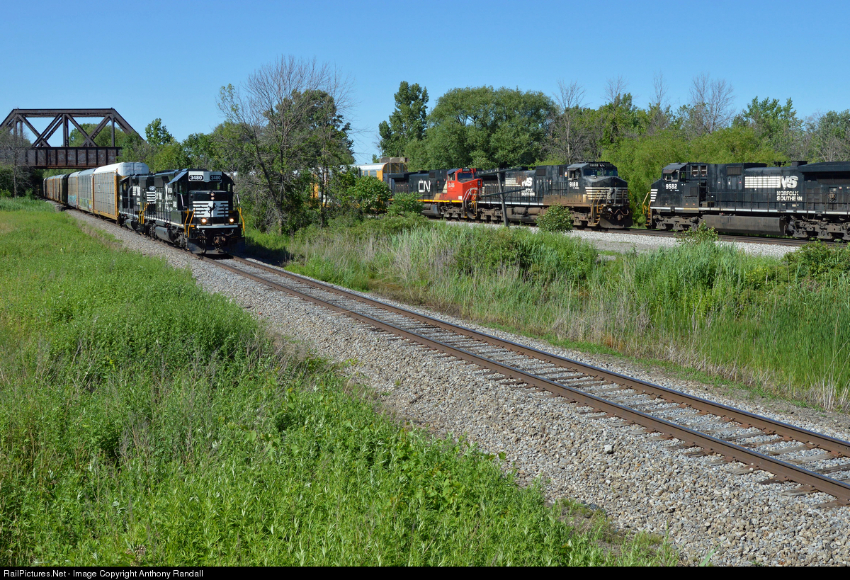 | Three trains meet at Blasdell: Westbounds 28Q and 287 await the passing of eastbound 206 at the beginning of single track west of Buffalo. 28Q has a rare SD40-2/GP38-2 set leading empty racks for Detroit. |