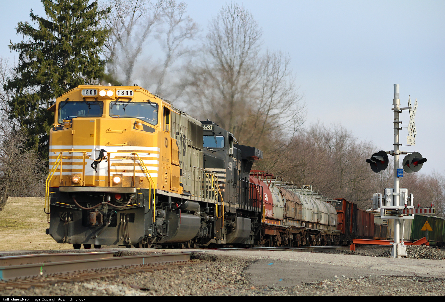 Yellow and grey NS 1800 leads NS 17G over the crossing at Gray Station, PA.
