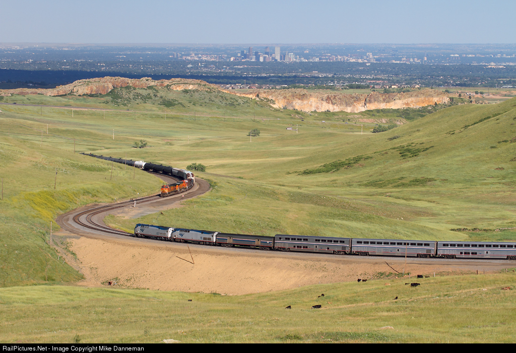 Amtrak’s California Zephyr meets a westbound BNSF freight at Rocky, Colorado, on the afternoon of June 28, 2014. In the background is the city of Denver, where train 6 will be making a station and service stop in a half hour or so.