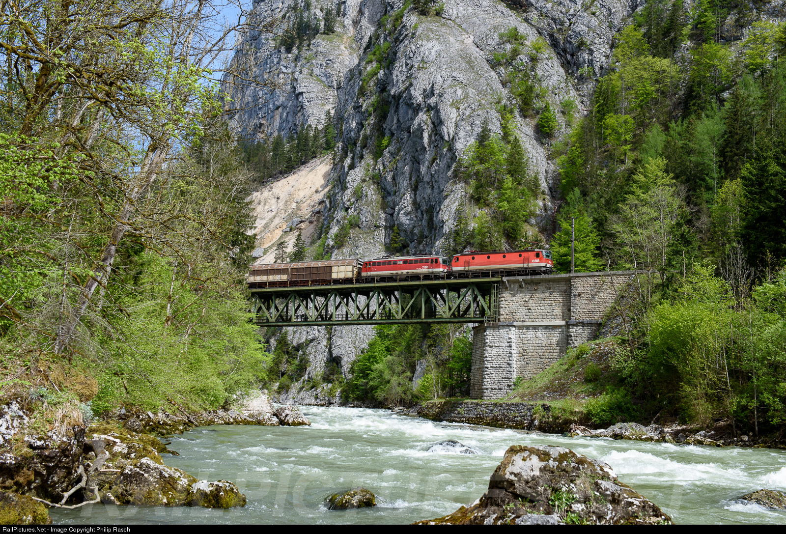 | ÖBB 1144.014 and 1142.618 haul the 54076 freight service across the bridge over the river Enns near Gesäuse Eingang in Styria, Austria. |